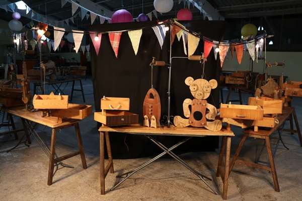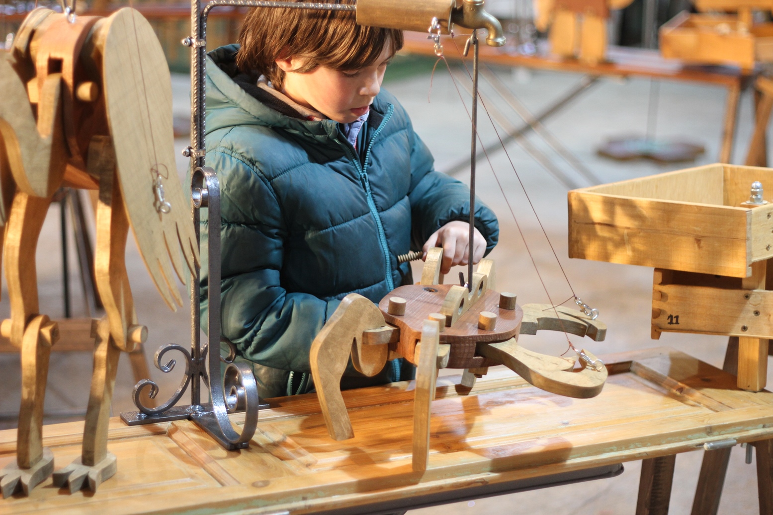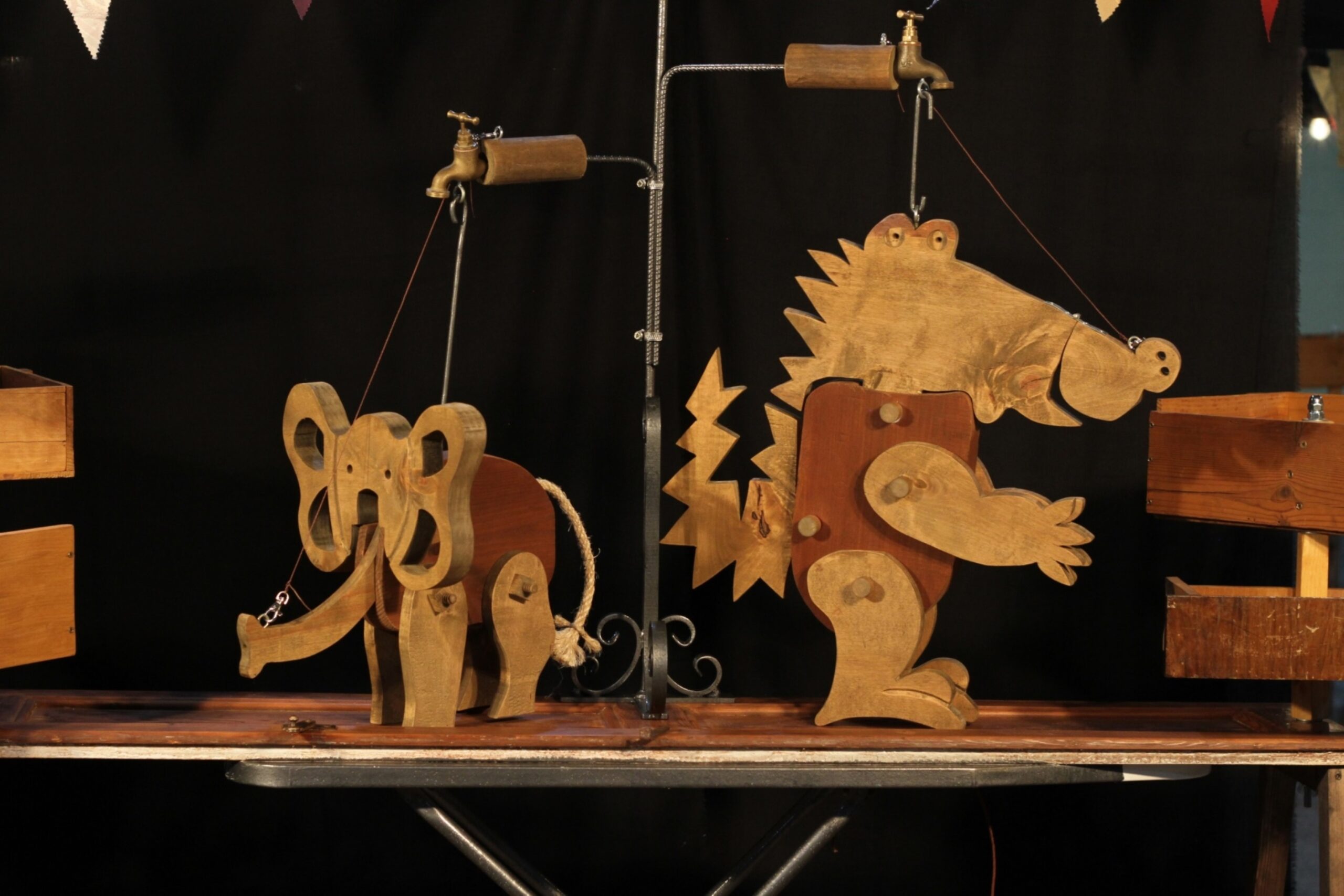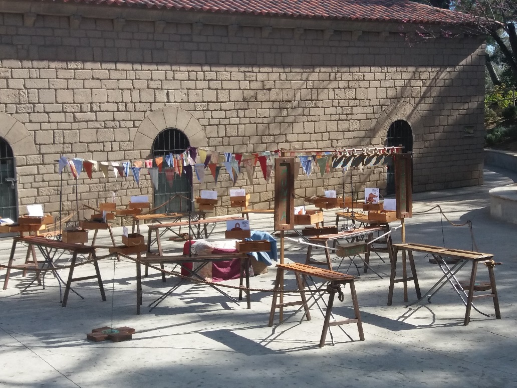 En mig de la plaça apareix un espai molt peculiar. Un conjunt de taules de planxar amb porticons antics es convertiran en bancs de fuster. On els infants hi muntaran els titelles animals.